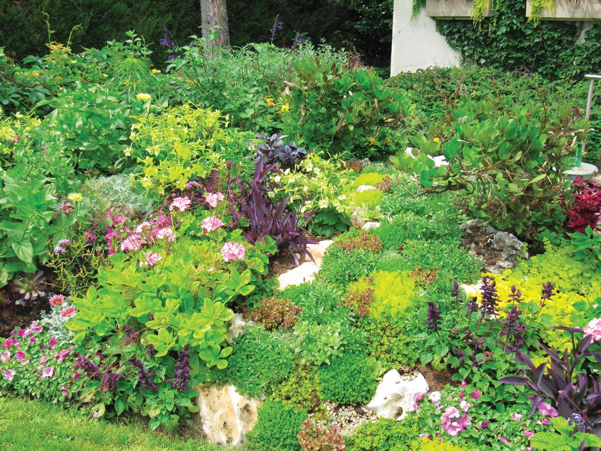 L’idée ? Inspirer calme et sérénité aux visiteurs, notamment grâce à un camaïeu de violet tirant sur le rose. Ainsi, au centre, face à l’escalier de l’accueil, une rivière de sédums de différentes variétés aux tonalités jaune-vert, bordées de pierres, s’écoule tranquillement. De part et d’autre, des buis secs sont revalorisés en servant de tuteurs aux fleurs des Cobea scandens, créant alors comme des bonzaïs. Se dessine ainsi un massif tout en douceur, en ondulations et en poésie, pour un séjour beaunois zen.
