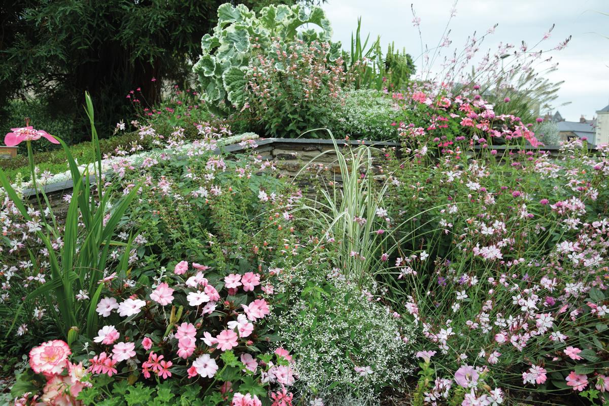 Entre fraîcheur et douceur, ce massif situé sur un rond-point en cœur de ville décline une palette colorée allant du rose bonbon au blanc pur. Aux mille et une fleurettes vaporeuses des euphorbes ‘Diamond Frost’, s’ajoutent les étoiles délicates des gauras, les pompons légers des amarantines globuleuses, les rosettes généreuses des impatiens ou encore les hampes élancées des sauges, composant ainsi une alchimie vivifiante. Pour apporter encore un peu de légèreté, les feuillages panachés des choux, cannes de Provence et Miscanthus aèrent l’ensemble, sans oublier vert grisé des coussins argentés. Une vraie bouffée d’oxygène, à consommer sans modération !