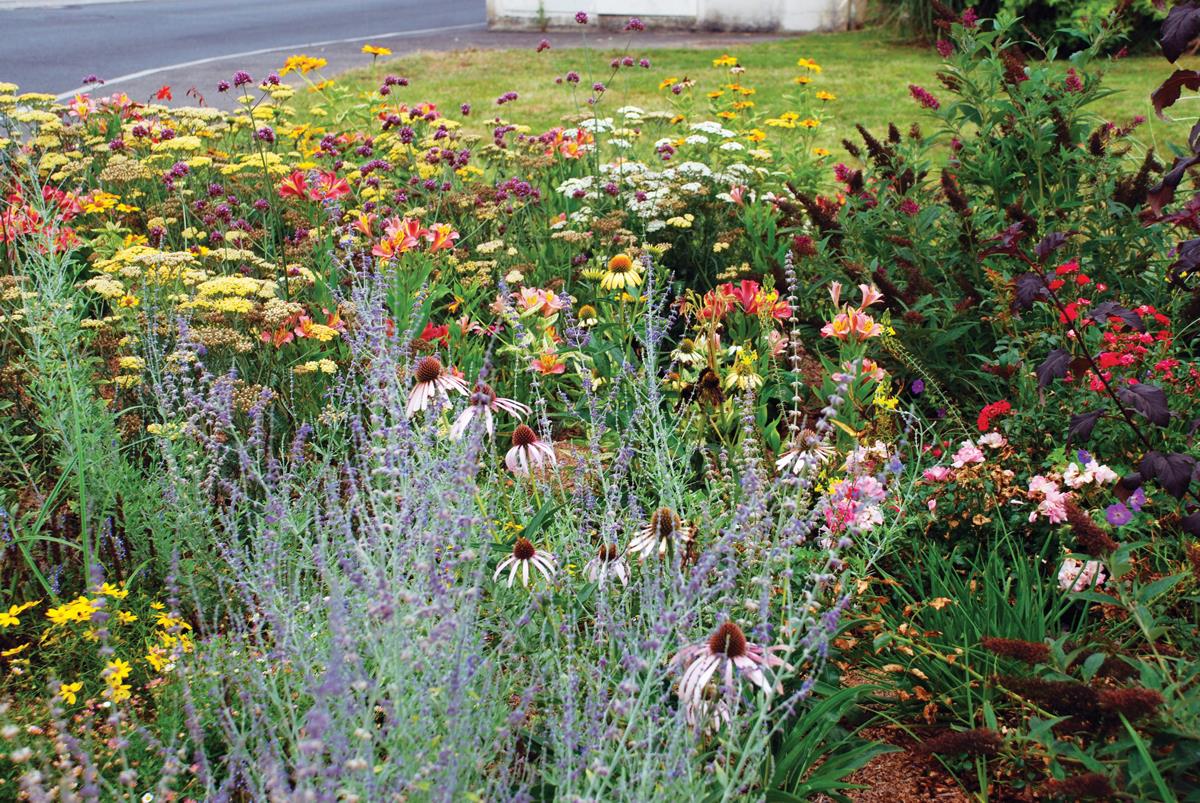 En effet, la composition de ce massif fleuri s’inspire des œuvres du sculpteur controis Jean-François Maubert, très apprécié par les habitants, que l’on pouvait découvrir cet été au gré d’une balade artistique. Ce massif pérenne, équilibré et raffiné, révèle les nuances de la sculpture voisine par un jeu de couleurs complémentaires. Et c’est sans compter sur la diversité des formes et des teintes des floraisons qui, entre les épis élancés des Perovskia, les corymbes des achillées, les étoiles des rudbeckias, les têtes rondes des verveines ou les grappes des buddléias, composent une œuvre d’art à part entière. Il n’y a plus qu’à contempler…