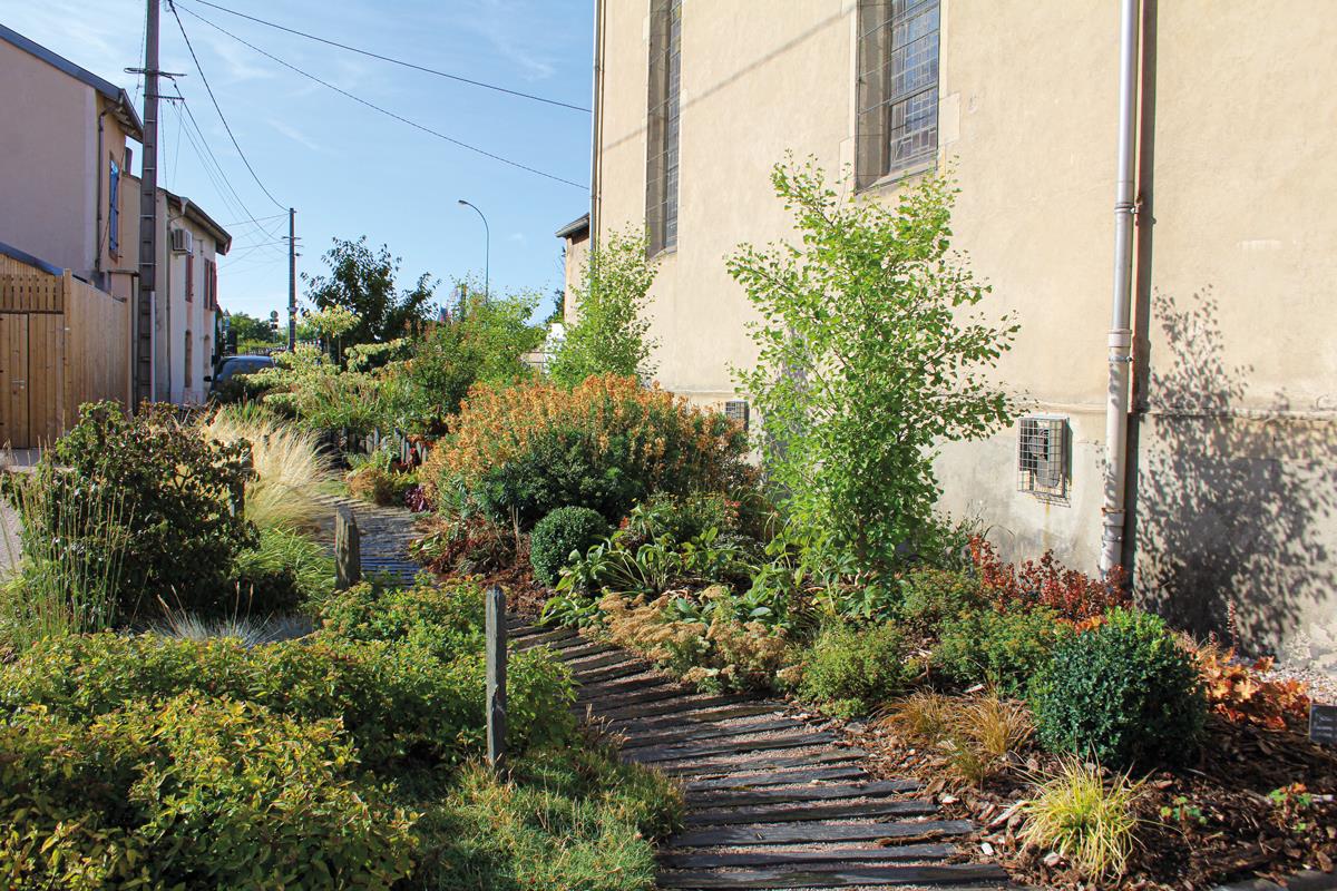 Un des espaces à végétaliser était suffisamment large pour l’aménager comme un petit square. Les jardiniers ont donc réalisé un chemin en traverses d’ardoise, ainsi qu’un espace de détente circulaire. Là, des paillis d’ardoise viennent délimiter l’espace et des moraines en granit, issues d’une carrière locale, servent d’assises. Côté végétaux, trois Ginkgo biloba ‘Fastigiata’ ont été plantés pour apporter de la verticalité, accompagnant ainsi l’édifice. Les zones de plantation étant volontairement non connectées à un réseau d’arrosage automatique, la palette végétale intègre des essences d’arbustes, de vivaces et de graminées résistantes à la sécheresse, avec toutefois des floraisons alternées, des feuillages décoratifs et persistants.