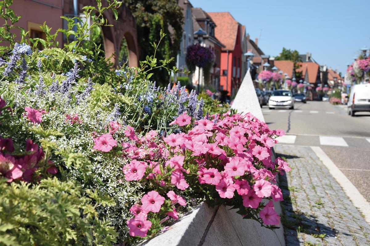 En écho au fleurissement aérien de couleur pastel, ce massif assure la continuité de l'ambiance de la rue commerçante. S’ajoutent du bleu et du blanc pour évoquer l'eau, sans oublier les Pennisetum ‘Tail Feather’ qui jaillissent tel l'ancien jet de la fontaine. Et surprise : des zinnias et célosies orange, issus des semences de l'année passée, se sont invités à la fête. Leurs fleurs se mêlent généreusement à celles des Gerbera et Alstroemeria, vivaces qui seront réaffectées dans des massifs durables ou stockées en pépinière pour l'année prochaine. Le tout est paillé de cosses de sarrasin qui protègent les sols de l’évaporation, de l’érosion et de la compaction. Ce paillis limite également la consommation en eau (2 arrosages/semaine) et empêche le développement des adventices. Un massif qui fait des remous, comme en témoignent les cascades de fleurs des surfinias qui débordent joyeusement de la fontaine !