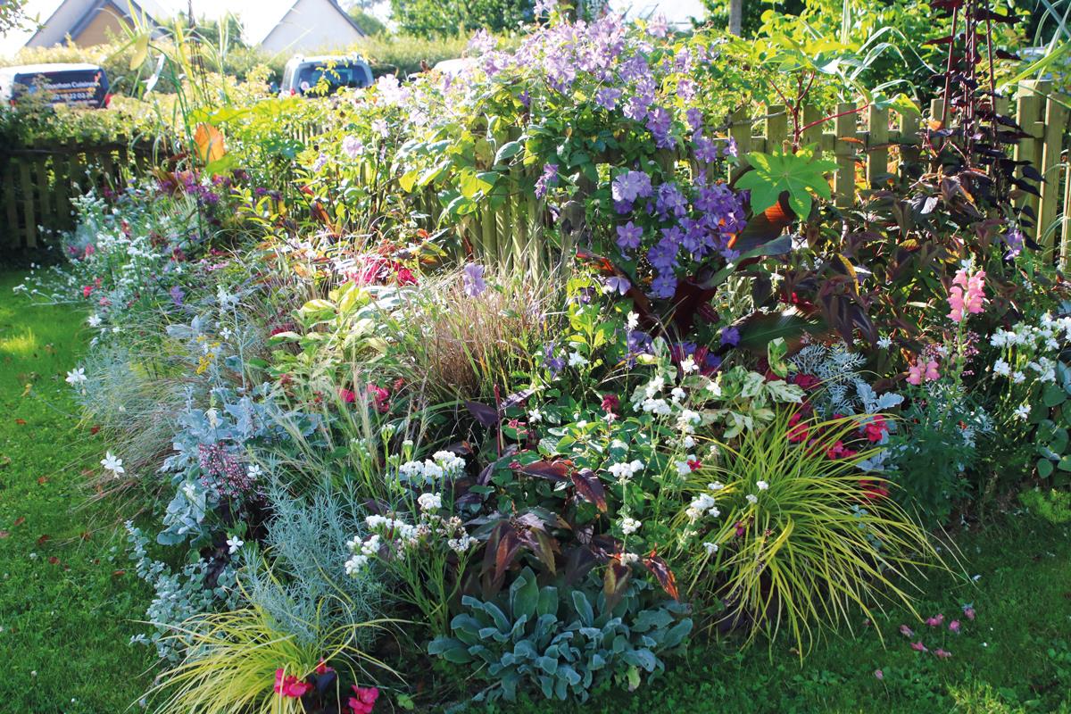 Un vrai régal pour les yeux des passants et les insectes pollinisateurs, sans oublier pour autant l’harmonie d’ensemble. Selon une gamme chromatique autour du rose, du pourpre, du blanc et du gris, se dessine un juste équilibre visuel. Et malgré cette diversité, chacune des espèces a sa place et son rôle à jouer. Par exemple ? Le Senecio ‘Vira Vira’, au port divergeant et au feuillage très découpé, habille parfaitement les bords du massif. Quant à l’Ipomoea ‘SolarPower Black’, utilisée habituellement comme grimpante, elle est du plus bel effet lorsqu’elle retombe et recouvre le sol. Entre diversité et unicité, le tour est donc joué !