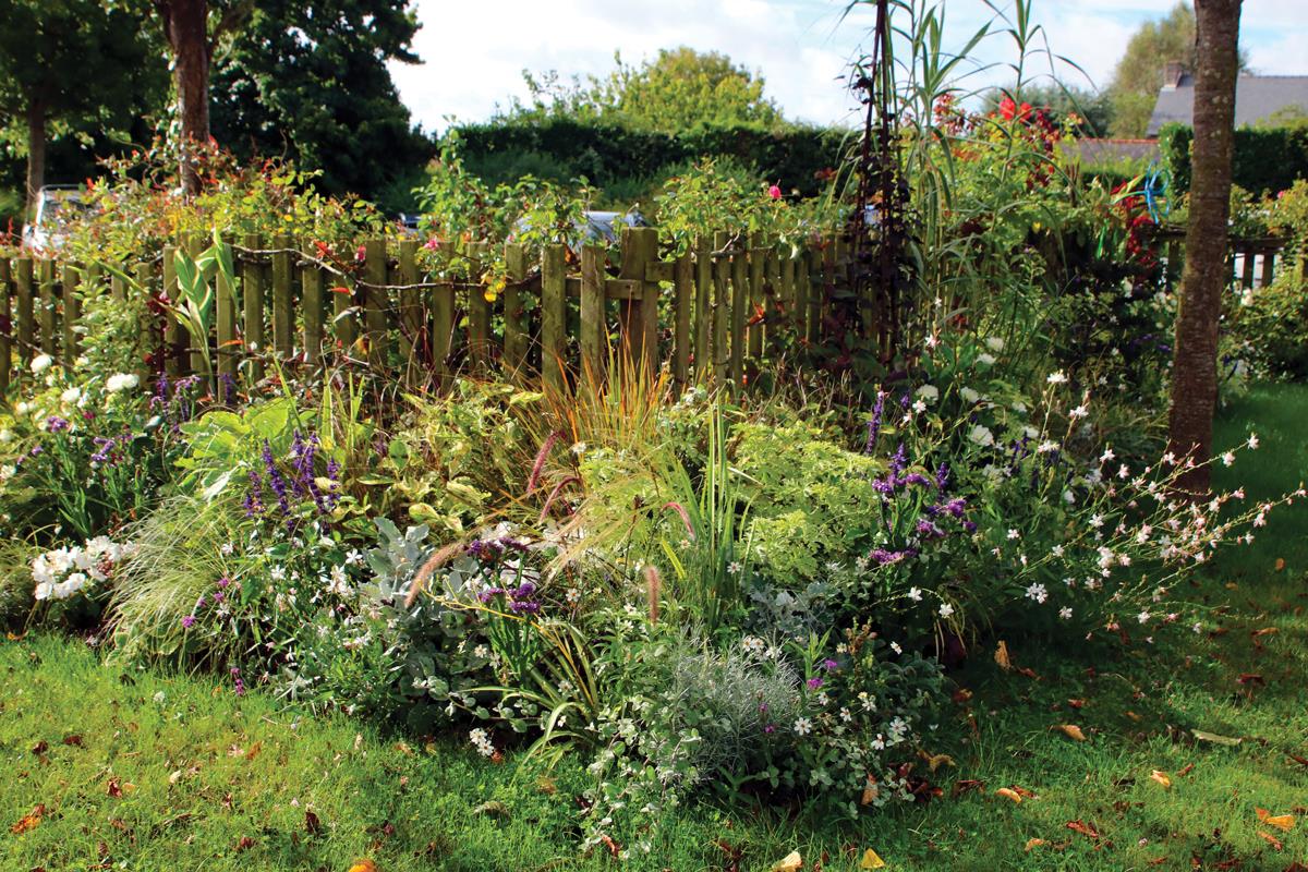 Privilégiez le panaché et vert pomme, sans oublier une pincée de gris. Ils sont ensuite mélangés à une goutte de pourpre obscur contrasté, celle des choux ou de l’ipomée ‘Solar Tower Black’. Une belle découverte que cette patate douce qui s’amalgame à l’ensemble et s’agrippe aux branches des fers à béton. Puis, on ajoute une bonne quantité de floraisons blanches, relevées par une petite dose de bleu, et le marbré est finalisé. Il n’y a plus qu’à déguster !